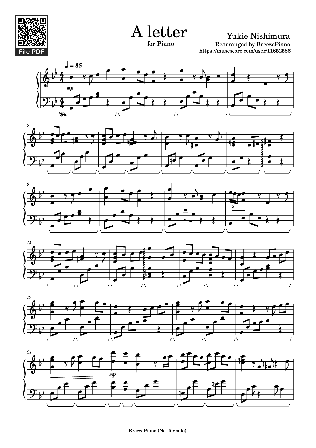 A Letter Piano by Yukie Nishimura. All music sheets and PDF files provided here are shared for educational and practice purposes only. The sheets include notes and chords for reference and non-commercial use. We do not sell or claim ownership of any copyrighted material. All copyrights belong to the original composer and copyright holders.