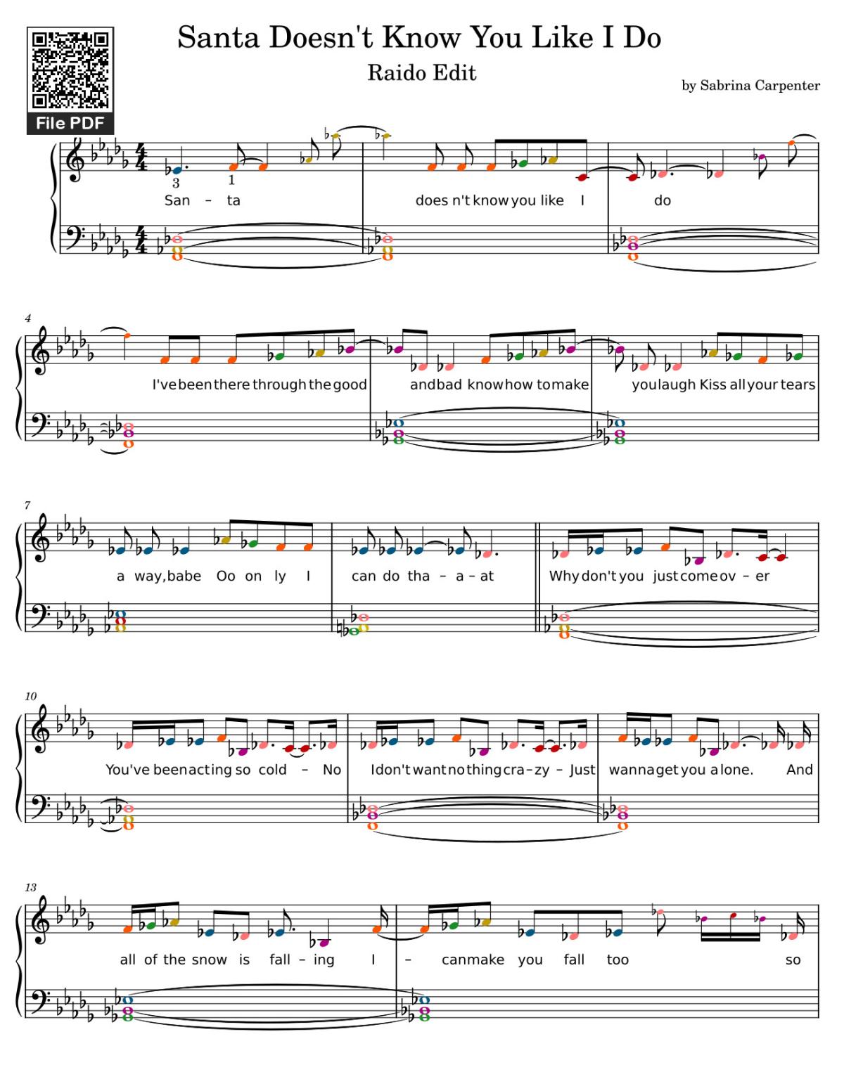 The videos/audio files Santa Doesn't Know You Like I Do Sheet Piano by by Sabrina Carpenter are embedded from YouTube, MuseScore, or other third-party sources. Availability depends on the original platforms and may change due to copyright rules, policies, or advertisements. If a video or audio file cannot be played, it may have been removed by the source.