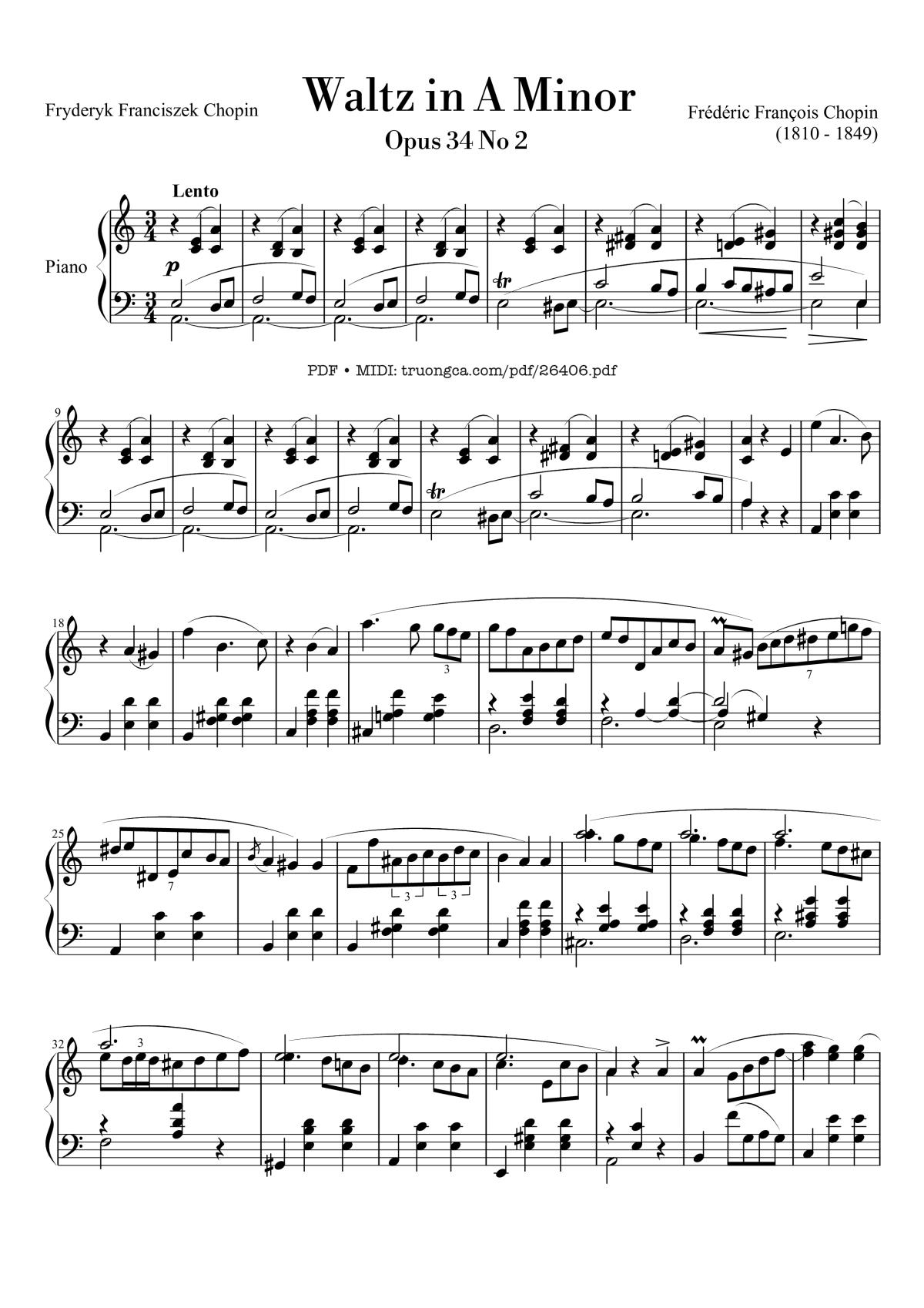 The videos/audio files Waltz in A Minor, Opus 34 No 2 by Frédéric François Chopin are embedded from YouTube, MuseScore, or other third-party sources. These videos are subject to third-party copyright control and may be removed in accordance with YouTube’s copyright rules or the policies of the respective platforms, and may include advertisements. If you are unable to access these songs, it means they may have been removed by the original source.