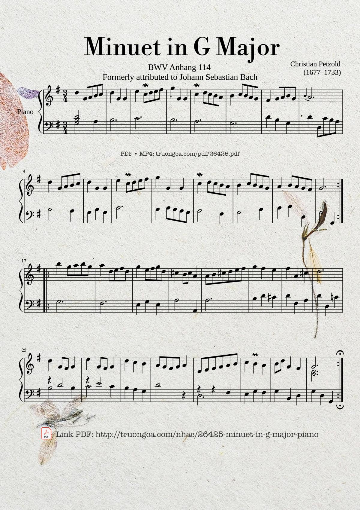 The videos/audio files Minuet in G Major Piano by Christian Petzold are embedded from YouTube, MuseScore, or other third-party sources. Availability depends on the original platforms and may change due to copyright rules, policies, or advertisements. If a video or audio file cannot be played, it may have been removed by the source.