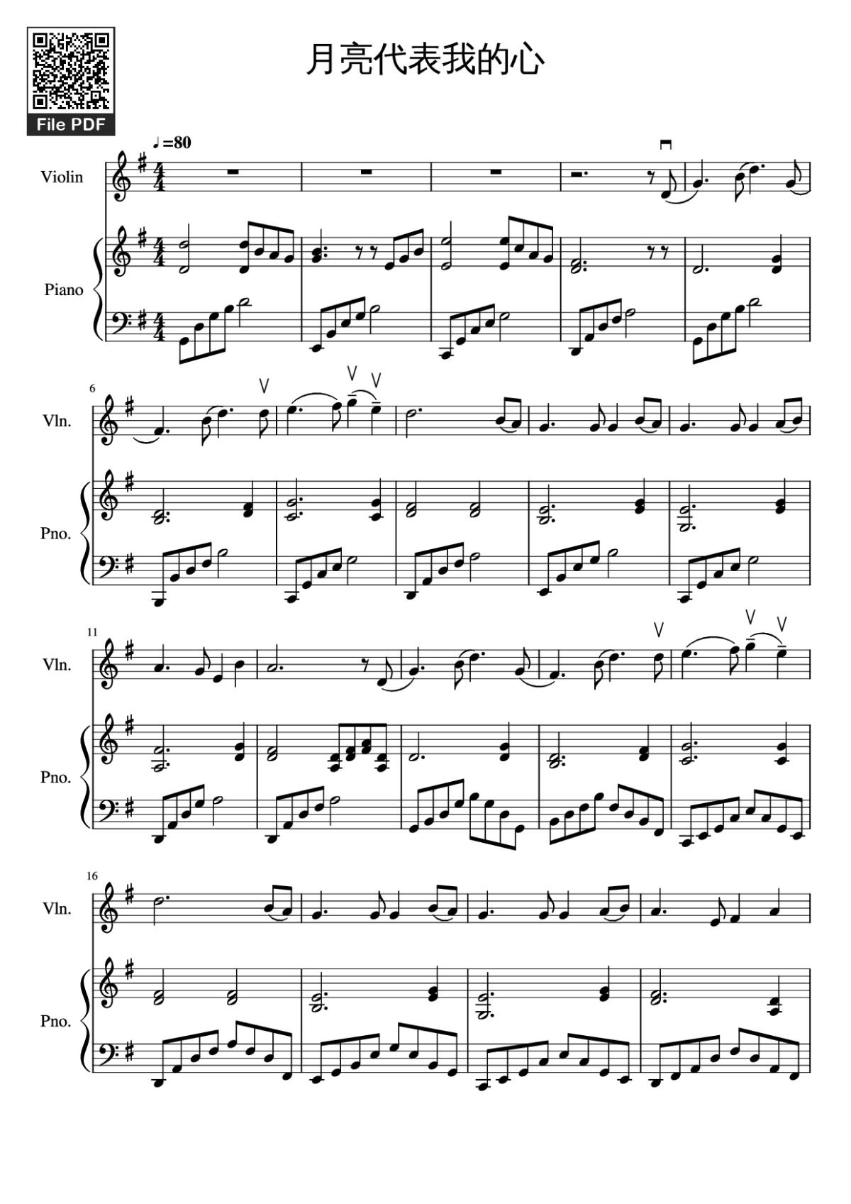 More similar sheet PDFs: 月亮代表我的心 Piano Violin: