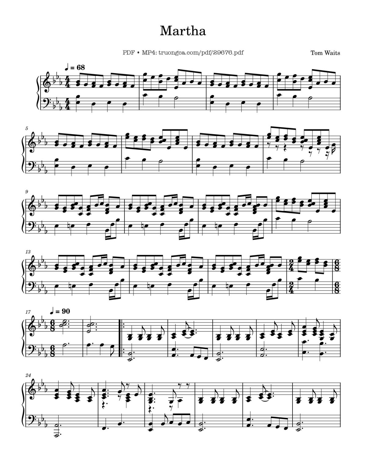 The videos/audio files Martha Piano by Tom Waits are embedded from YouTube, MuseScore, or other third-party sources. Availability depends on the original platforms and may change due to copyright rules, policies, or advertisements. If a video or audio file cannot be played, it may have been removed by the source.
