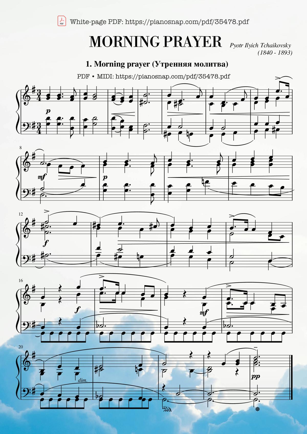 The videos/audio files Tchaikovsky Morning prayer Piano by Pyotr Ilyich Tchaikovsky are embedded from YouTube, MuseScore, or other third-party sources. Availability depends on the original platforms and may change due to copyright rules, policies, or advertisements. If a video or audio file cannot be played, it may have been removed by the source.