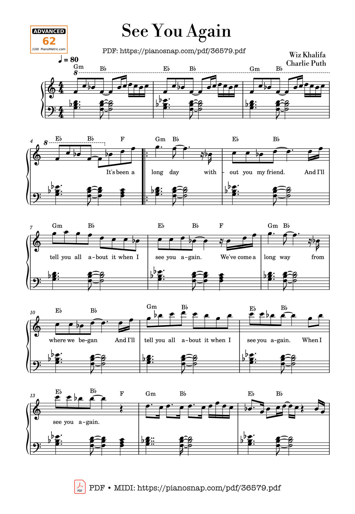 Please contact us to get MIDIThe videos/audio files See You Again (Solo Piano) by Wiz Khalifa are embedded from YouTube, MuseScore, or other third-party sources. Availability depends on the original platforms and may change due to copyright rules, policies, or advertisements. If a video or audio file cannot be played, it may have been removed by the source.